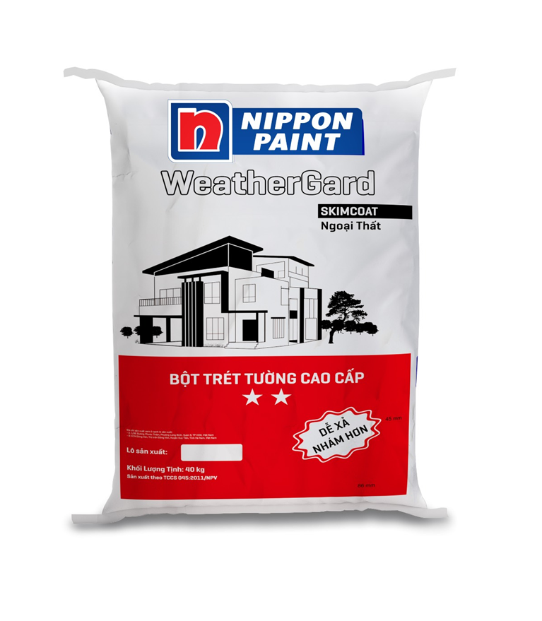 Bột trét Nippon Skimcoat WeatherGard được pha chế đặc biệt để đáp ứng nhu cầu thẩm mỹ về sự vá đầy các vết nứt nhỏ cũng như làm làn mịn hơn cho các bề mặt phần nề.